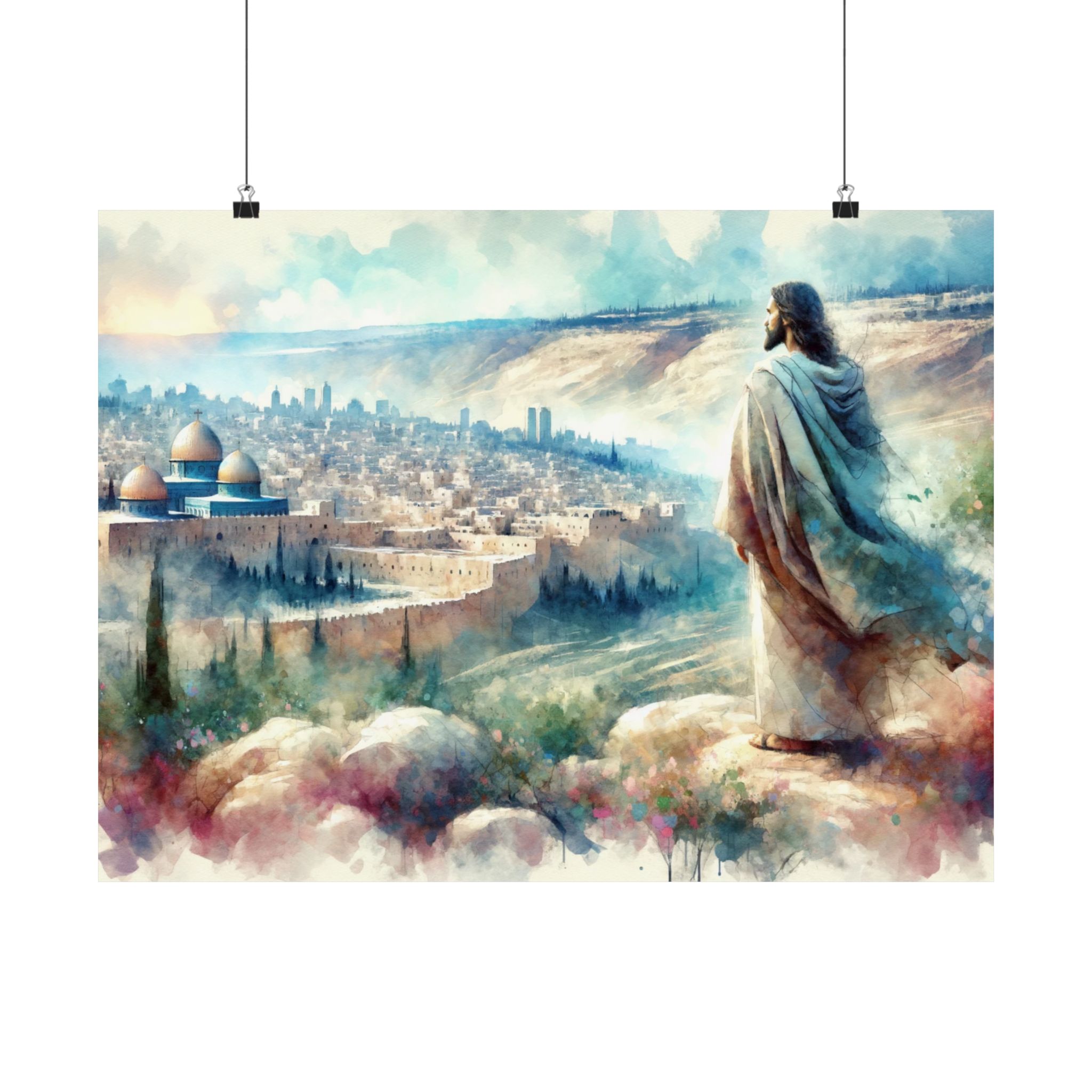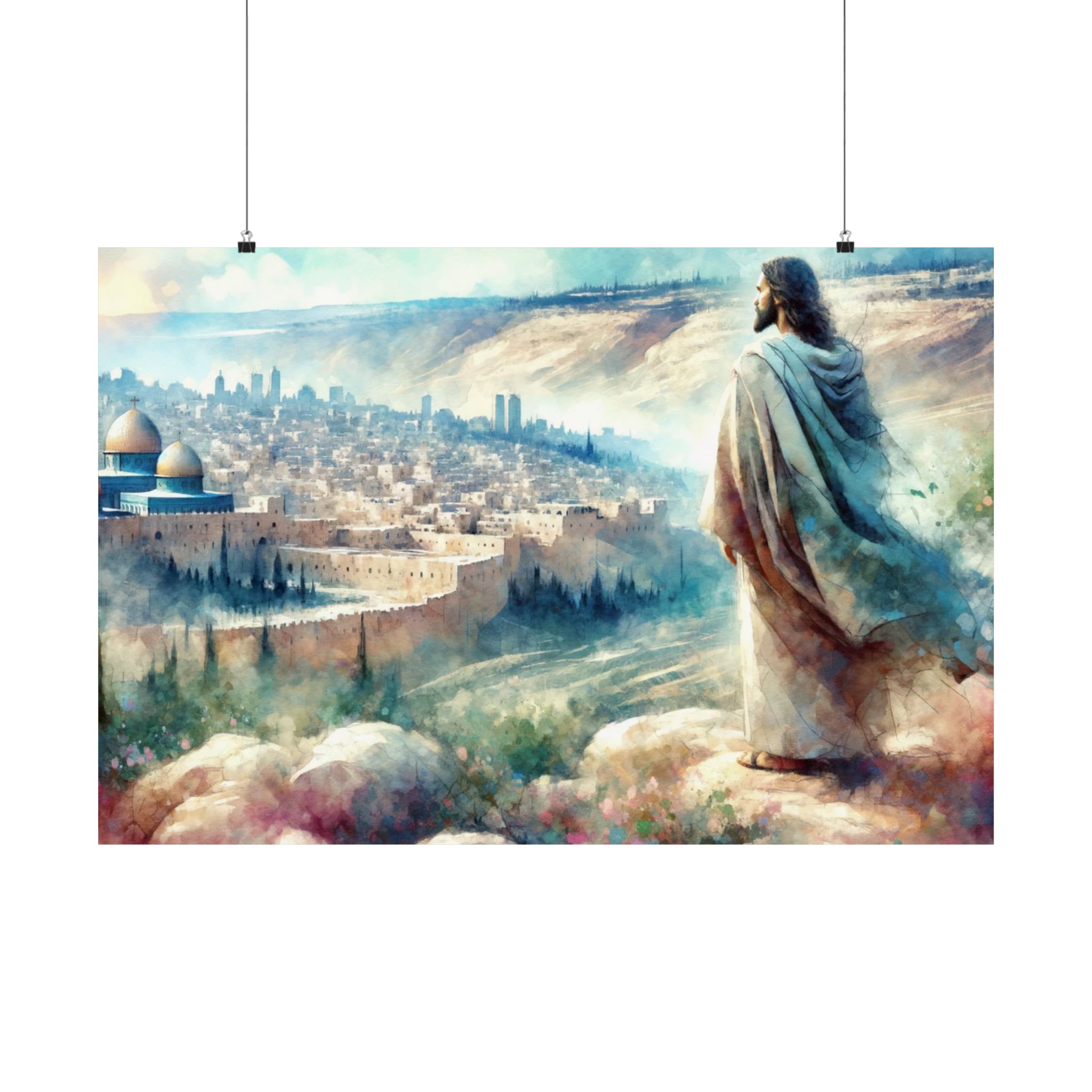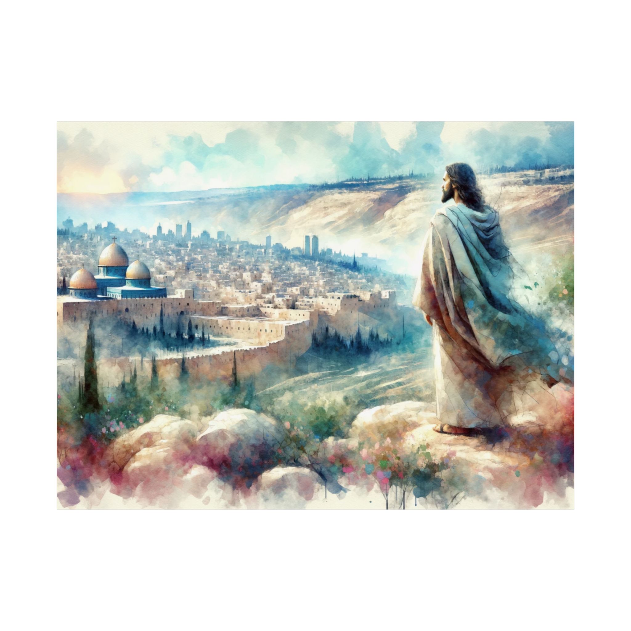 This striking watercolor style print captures a poignant moment as Jesus overlooks the city of Jerusalem, his expression a blend of love and sorrow, encapsulated by the heartfelt exclamation, “O, Jerusalem.”